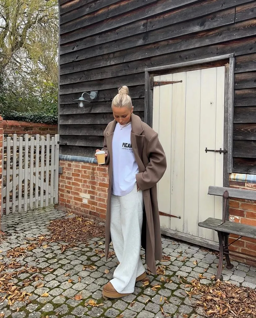Light-wash denim, straight-leg jeans, skinny jeans, and wide-leg jeans all fit easily under these coats. Sneakers, boots, and mini Uggs keep the outfits relaxed and wearable.
