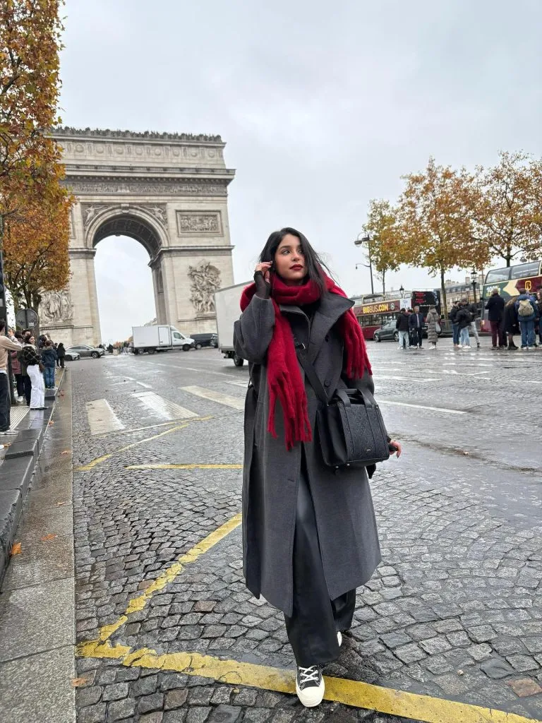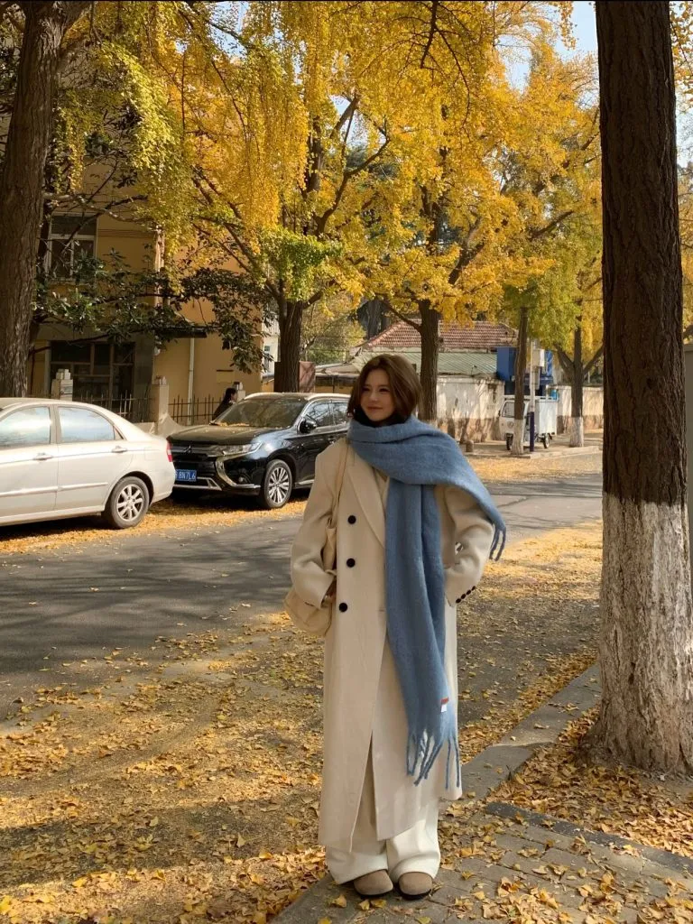 Chunky scarves, knit sweaters, and soft layers bring warmth and comfort. A bold scarf, like red or blue, adds life to neutral outfits without overpowering them.
