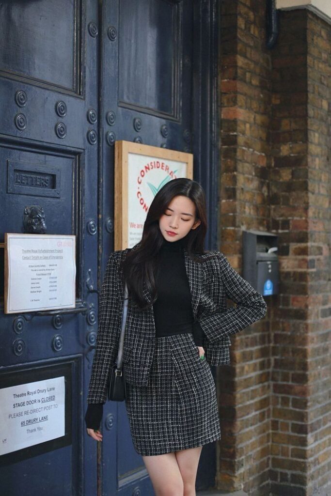 This pairing focuses on classic winter tailoring. The tweed blazer brings depth and structure, while the black skirt keeps the outfit grounded and versatile.