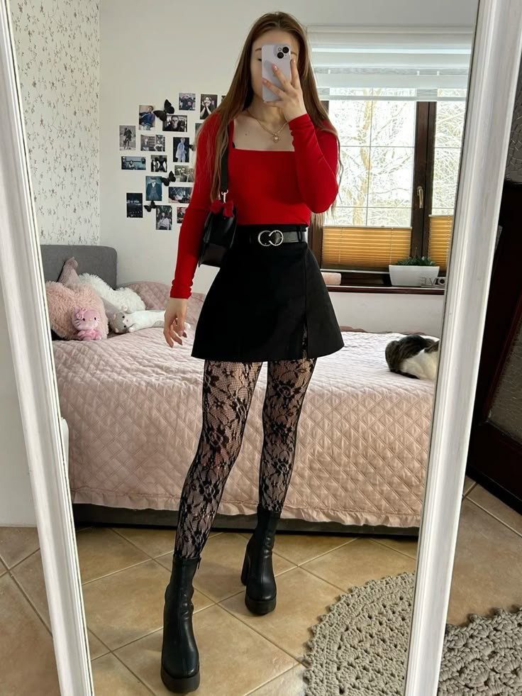 Black Skirt with Bold Red Sweater
