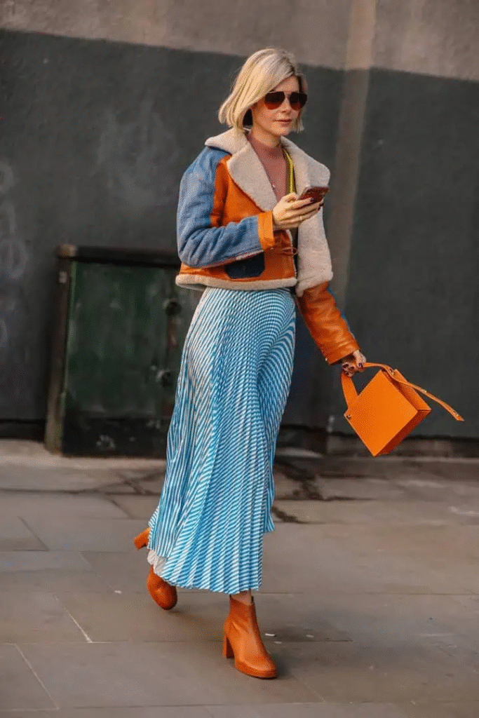 A bright blue and orange coat layered over a striped maxi skirt brings energy to colder months. Coordinated accessories keep the palette cohesive, while rich textures make it a standout option among stylish fall outfits in London.
