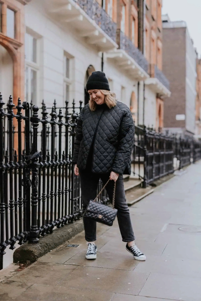 This look uses a quilted jacket to add texture and depth, grounded by dark jeans and monochrome sneakers. Finishing touches like a designer bag and beanie make it a fashion-forward outfit that’s still suited for long autumn days in the city.
