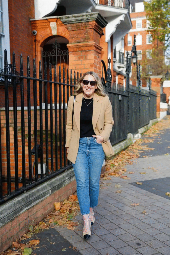 A camel blazer and blue denim pair for a timeless take on city fashion. Worn with a fitted black top and heels, this outfit moves easily from daytime errands to casual evening plans while maintaining a polished look.