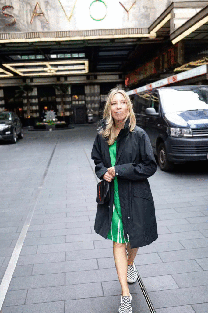 A vibrant green dress adds life to the outfit, while a long black coat tones it down for fall. Slip-on shoes in a checkered pattern round it out with character, balancing color and practicality for autumn outings.