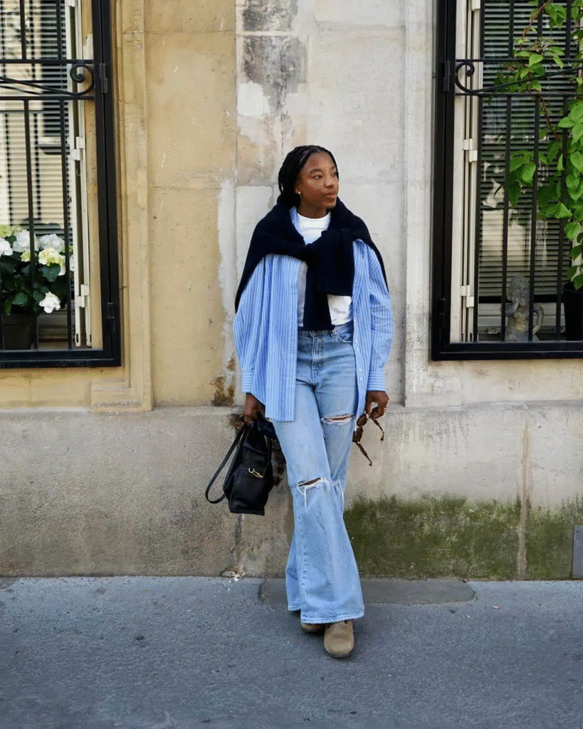 A loose striped shirt worn with distressed denim creates relaxed proportions. A navy scarf and structured bag add layering and purpose, keeping the outfit suitable for both casual mornings and stylish midday breaks.