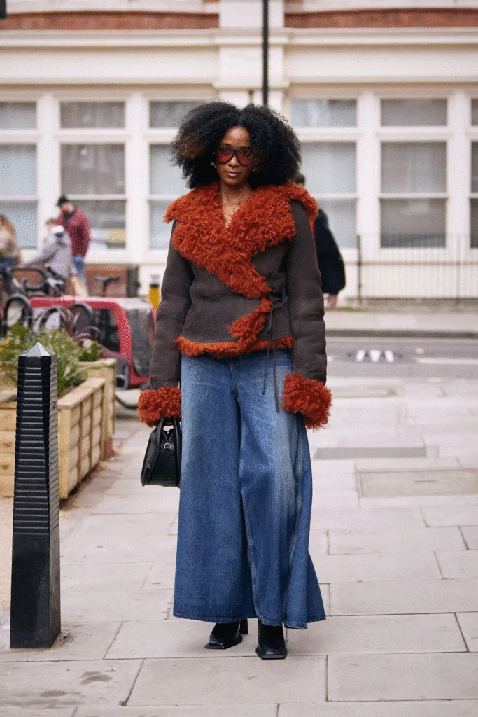 A suede jacket with shearling trim anchors this look, adding rustic texture to wide denim trousers. Simple accessories like a compact black bag and bold sunglasses bring urban polish, making this outfit a hybrid of countryside and city style.