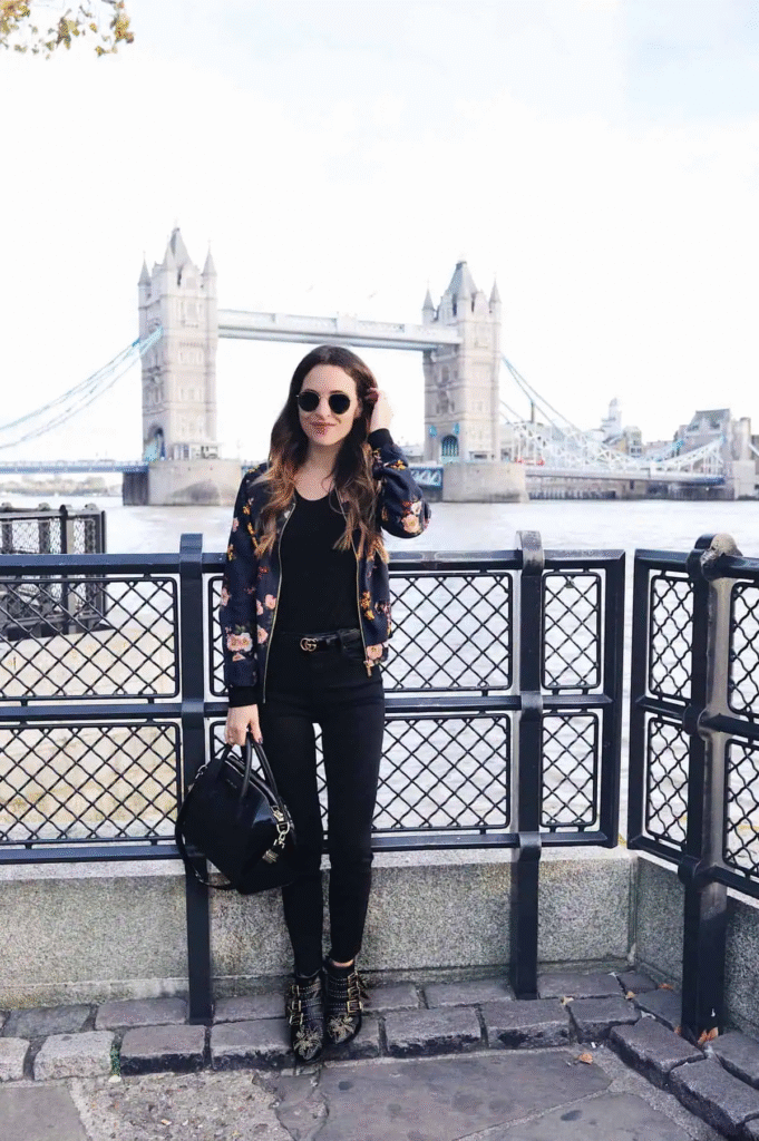 A dark floral bomber layered over a black base gives this outfit depth and a hint of softness. Edgy boots and a statement belt bring contrast, blending femininity and streetwear elements that define many Chic London Fall Outfits.
