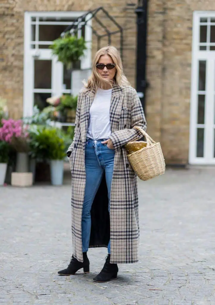 A floor-length plaid coat in soft neutrals pairs effortlessly with denim and a plain tee. The oversized fit adds drama without overwhelming, while subtle accessories keep the ensemble balanced for an autumn day spent walking the neighborhoods.