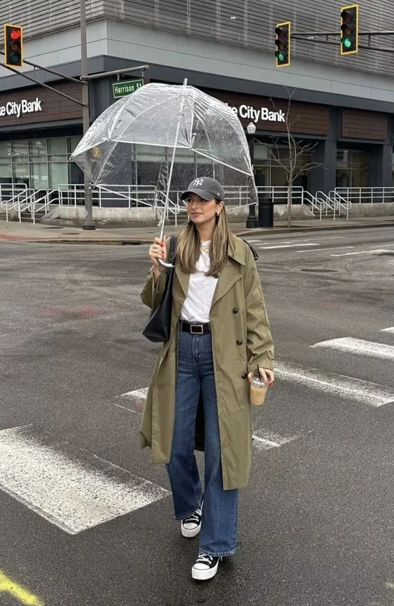The clear umbrella adds function without hiding the outfit, allowing the full look to remain visible and stylish. Paired with denim and comfortable shoes, this outfit balances ease and elegance, showing how Chic Rainy Day Outfits can feel effortless and refined.