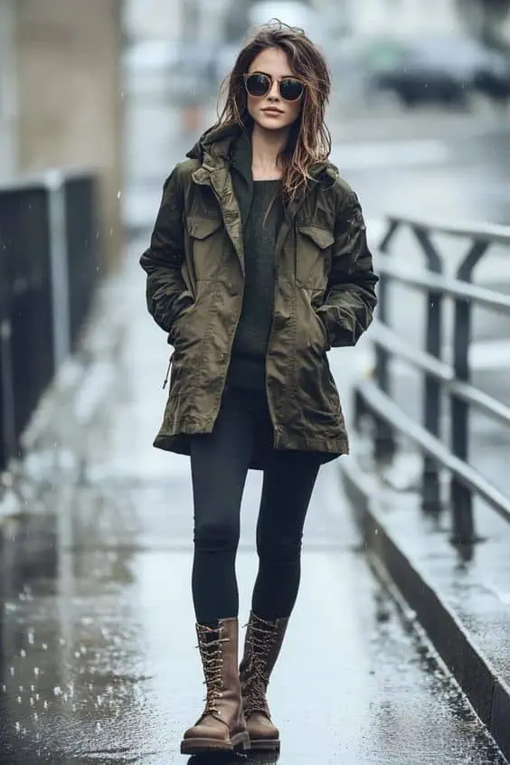 Black leggings and sturdy combat boots ground the outfit, while accessories like sunglasses and loose hair add personality. The contrast between soft and strong elements keeps the look visually interesting and proves rainy outfits can feel bold and fashion-forward.