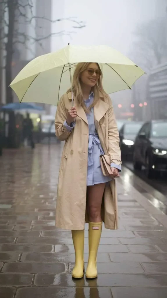 This ensemble shows how coordinated colors can instantly elevate rainy day dressing. A neutral trench acts as the base while colorful rain boots and accessories bring cohesion and personality to the look.