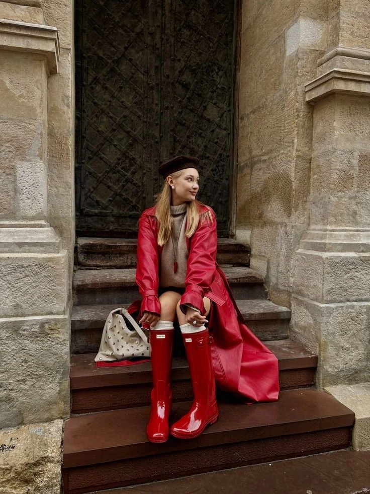 Using bold color transforms rainy weather into a style moment. A red raincoat paired with matching boots creates a strong visual impact that stands out against gloomy skies.