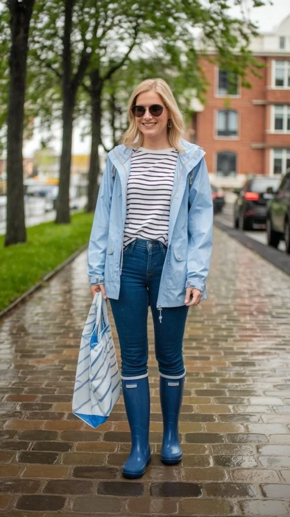 A lightweight rain jacket provides protection without bulk, and matching boots help pull the outfit together. The result is a fresh, nautical-inspired style that feels calm, chic, and weather-appropriate.