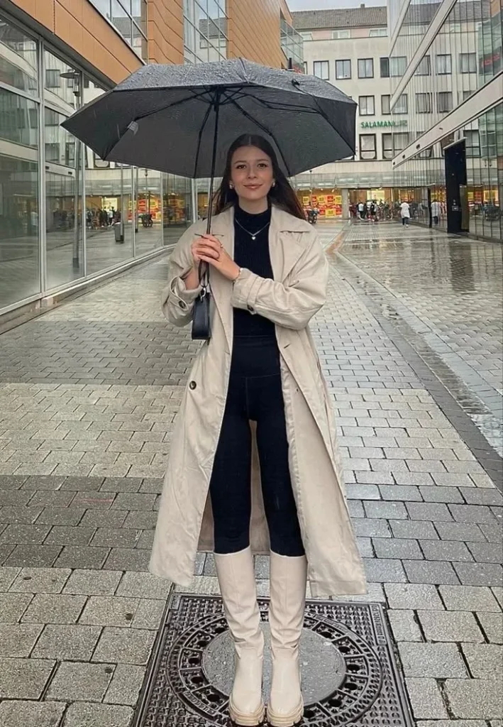 This combination focuses on timeless contrast to create a refined rainy day outfit. A light trench layered over darker basics feels clean, balanced, and flattering.