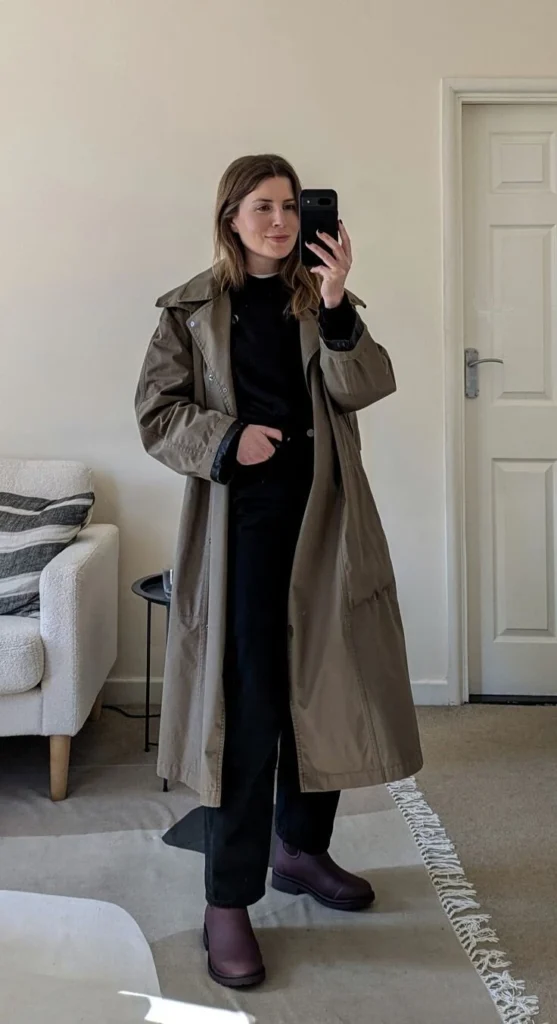 Minimal accessories keep the focus on the coat, allowing it to anchor the entire look. This outfit shows how Chic Rainy Day Outfits can feel strong, modern, and confident.
