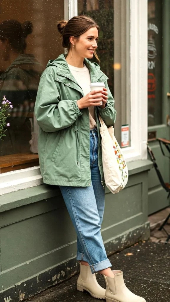 This look combines relaxed styling with thoughtful details. The sage jacket adds softness and color while still being practical for wet weather.