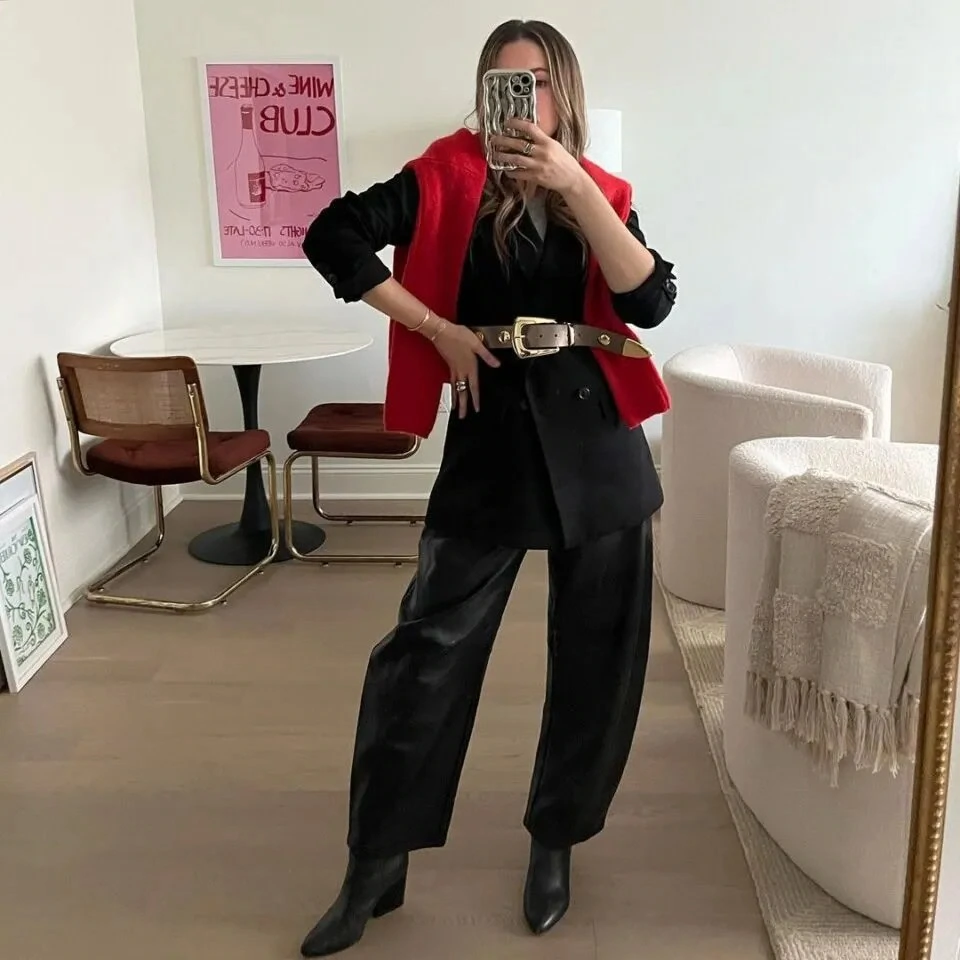 This outfit uses contrast to create a striking rainy day look. A red blazer layered over black basics adds structure, warmth, and personality.