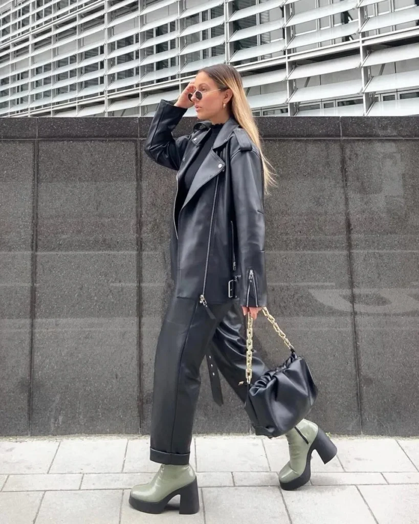 A leather trench adds instant edge and sophistication to wet weather outfits. Its oversized shape and durable material make it both practical and visually impactful.