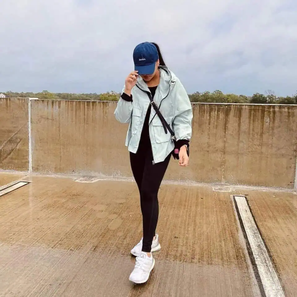 Leggings and sneakers keep the look practical, making it ideal for busy rainy days. It demonstrates how casual pieces can still feel intentional when styled thoughtfully.