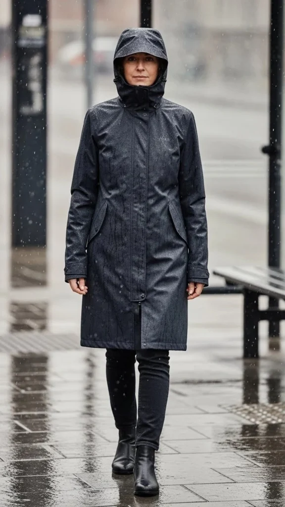 Layering within a single color palette creates a clean and modern rainy day look. A waterproof jacket paired with matching layers underneath keeps the outfit cohesive and functional.