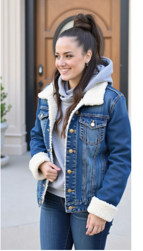 For a laid-back winter outfit, pair a denim sherpa jacket with a hoodie. The mix of textures—rugged denim and soft sherpa lining—adds depth while delivering cozy warmth. Choose oversized styles for a relaxed fit, layering them over a fitted hoodie to keep the shape balanced. Slim jeans or joggers work well on the bottom, and chunky sneakers round off the casual, street-style vibe.