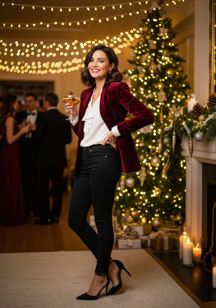 A velvet blazer adds a rich, soft texture that feels right for holiday nights.
