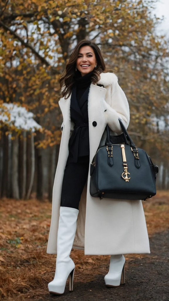 This look uses white tones to make a winter statement. A warm coat layered over a dark base keeps balance.