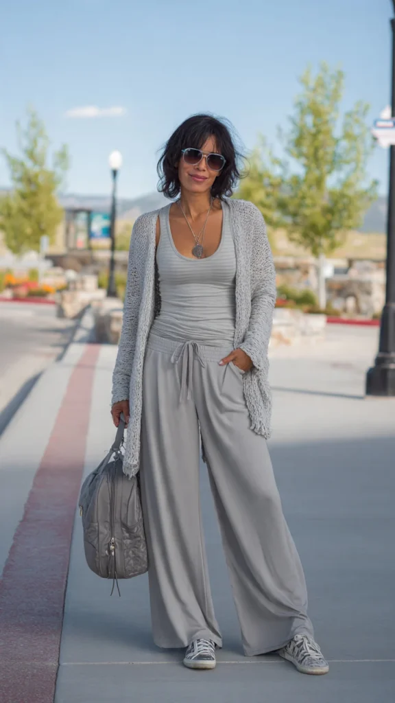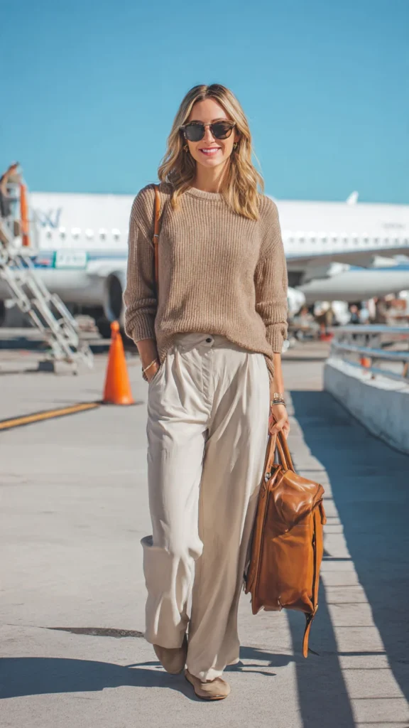 When I need breathable and flexible clothing, I opt for a ribbed tank with wide-leg pants. The stretch allows me to sit comfortably during flights, while a light cardigan adds a polished finish. It’s ideal for casual sightseeing or airport days when comfort and style need to work together.