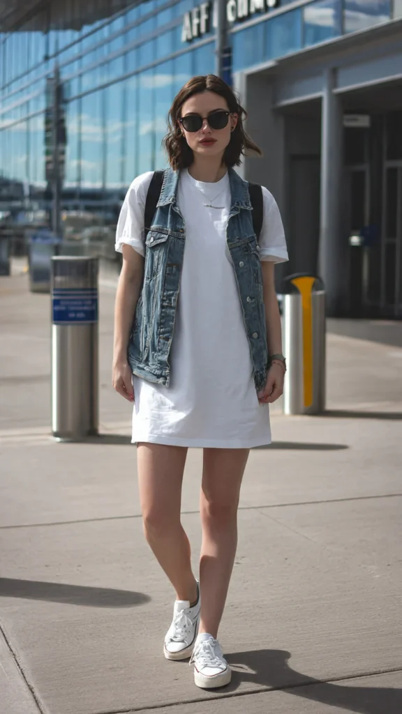 A T-shirt dress is my favorite one-piece for simplicity. It’s easy to wear, comfortable, and looks chic. Adding a denim jacket helps me adjust to cooler airplanes or evenings, making this outfit versatile for multiple travel situations without extra effort.