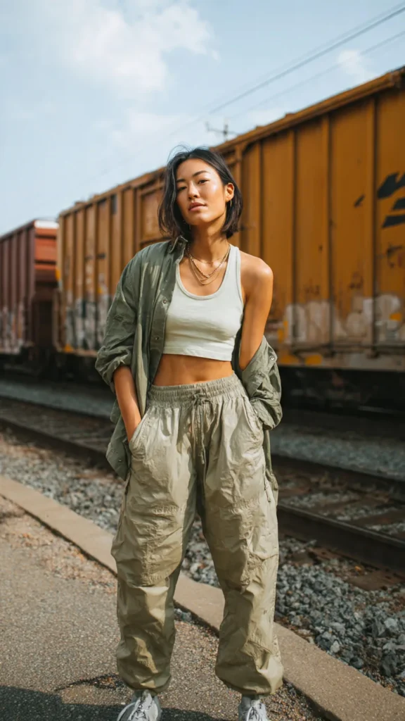 I like mixing sporty pieces with structured layers. An athletic top, tailored joggers, and an overshirt create a travel look that feels active and polished at the same time. It’s my choice when I want to feel energetic during transit but still presentable upon arrival.