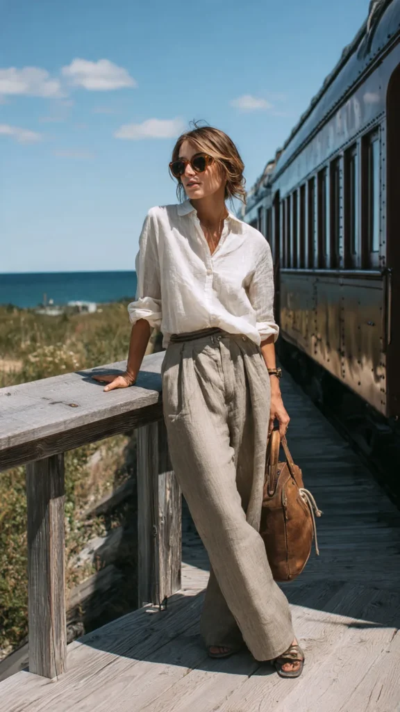 For hot destinations, I rely on a linen button-down with pull-on pants. Linen breathes naturally, and the pants are easy to move in while walking through airports or exploring new streets. This outfit keeps me cool, comfortable, and stylish in summer or tropical climates.
