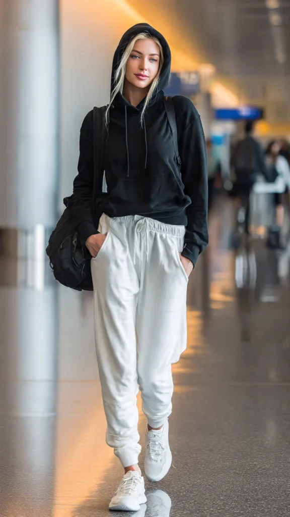 For casual early flights or overnight travel, I choose a soft hoodie, relaxed pants, and sleek sneakers. This combo is cozy for long layovers, practical for quick airport walks, and still looks polished when I arrive. It’s my ultimate choice for comfort without sacrificing style.