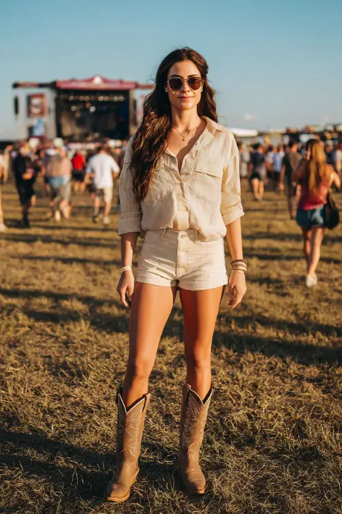 For hot-weather shows, I choose a lightweight linen button-up with high-waisted shorts. Rolling up the sleeves gives a relaxed, casual feel, while tall cowboy boots maintain the country vibe. Sunglasses and a few simple bracelets complete this breathable, stylish outfit that keeps me cool and concert-ready.