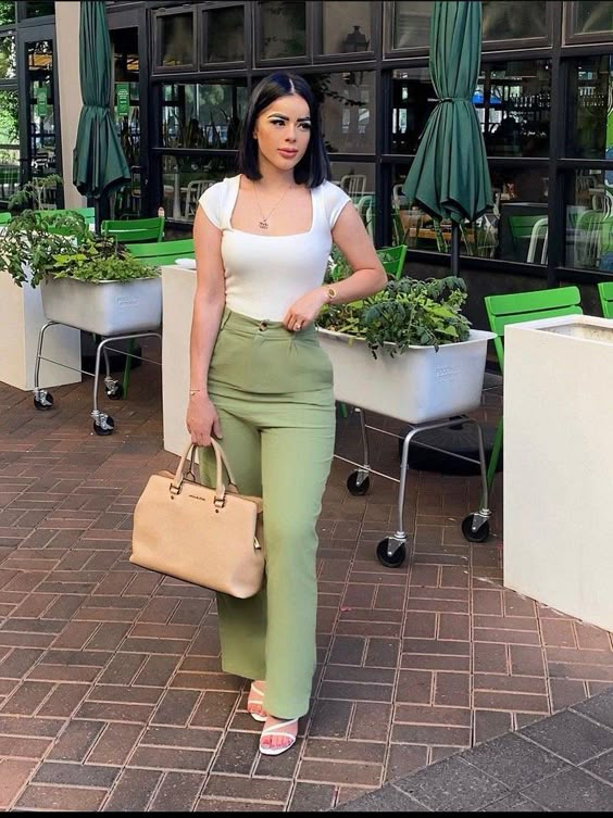 This outfit stands out because green isn’t a usual corporate color. The green suit pants with a white bodysuit bring a fresh, natural vibe into the office space, usually filled with black, white, beige, or brown. It’s a calm and confident look that shows you know yourself and are not afraid to add a pop of color with purpose.