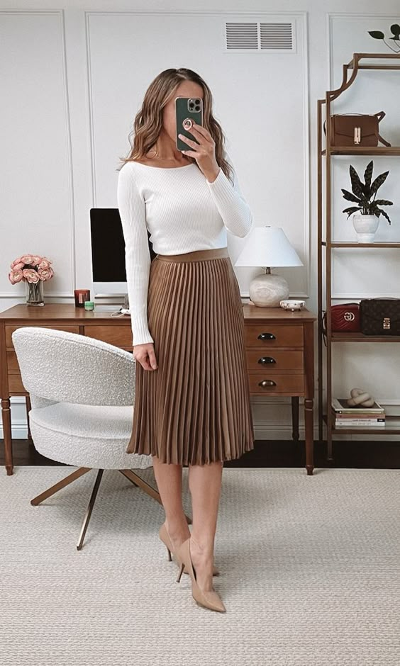This is a more feminine look, combining a soft white long-sleeve top that shows a bit of collarbone with a beige-brown mini skirt. Beige heels complete the outfit, which is elegant, graceful, and still very professional. It reminds us softness can be powerful.