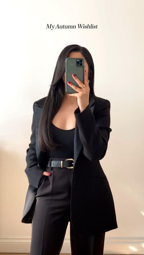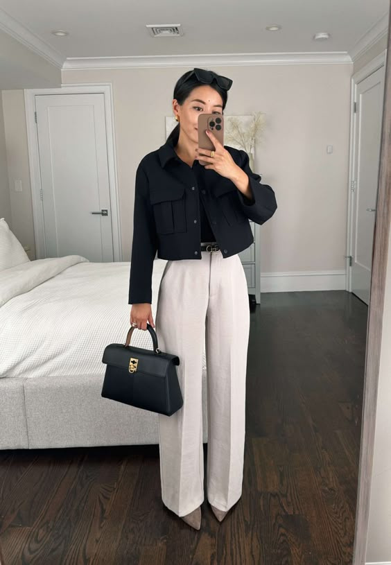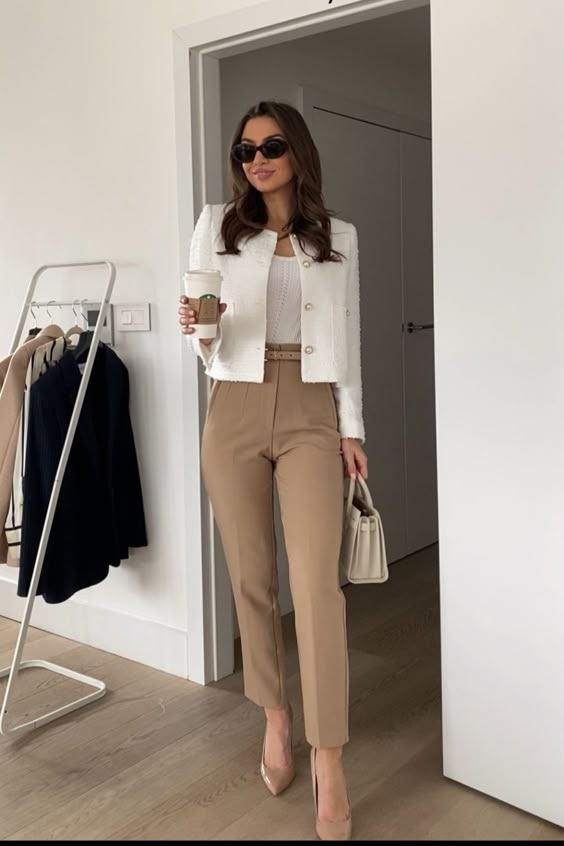 Sharp and sleek, this look combines a black blazer with soft beige pants. A belt cinches the waist, and a structured bag completes the professional style.