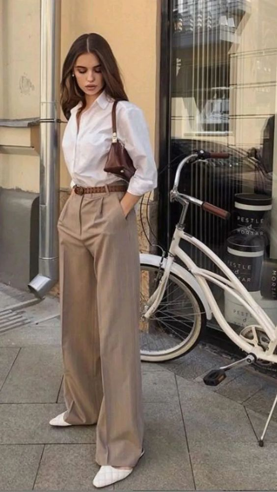 A simple and clean outfit pairing beige pants with a white button-down shirt. This look is timeless and adaptable to different styles or accessories.