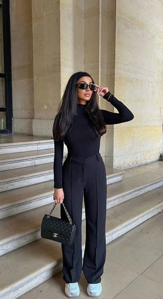 A mix of relaxed and tailored pieces with a black blouse and high-waisted trousers. White sneakers keep it casual but trendy. A structured handbag adds sophistication.