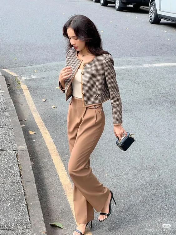 A modern, sophisticated look with a cropped houndstooth jacket and high-waisted trousers creating a sleek silhouette.
