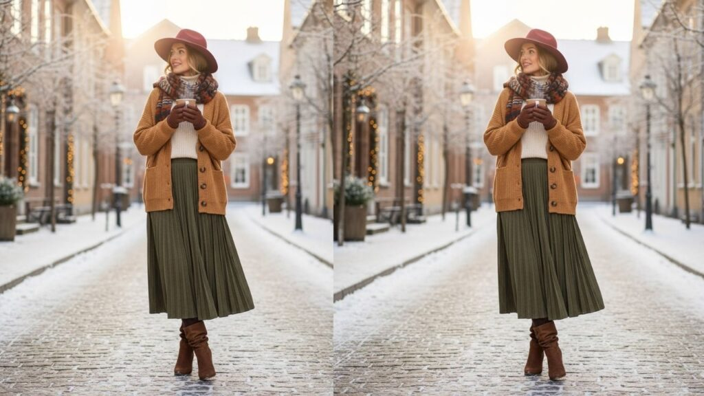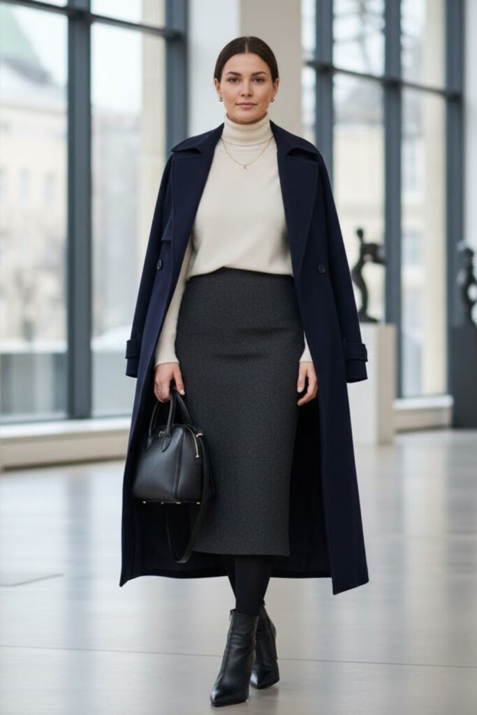 A tailored wool coat adds sophistication and structure. A longer coat matching your skirt’s length maintains outfit balance and keeps you warm.