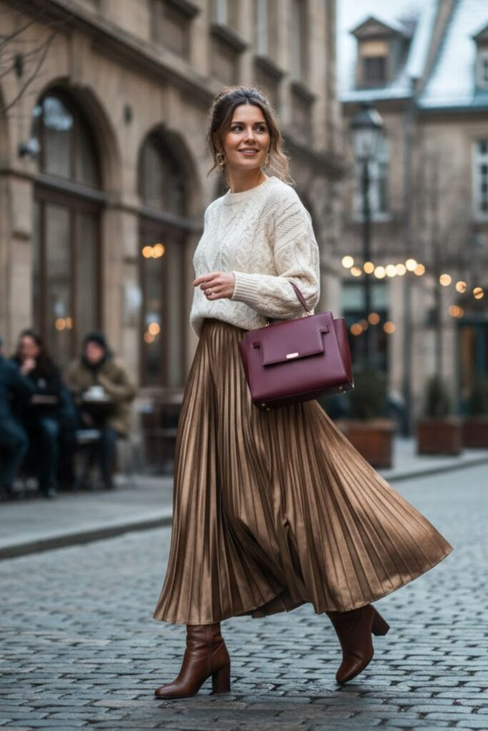Cream or beige chunky sweater with a metallic or satin pleated maxi skirt. Pair with ankle boots and a structured handbag for a chic, cozy daytime look.
