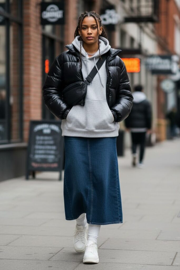 Casual street style with a denim maxi skirt and oversized hoodie. Add chunky sneakers or platform boots and layer with a puffer jacket for warmth.