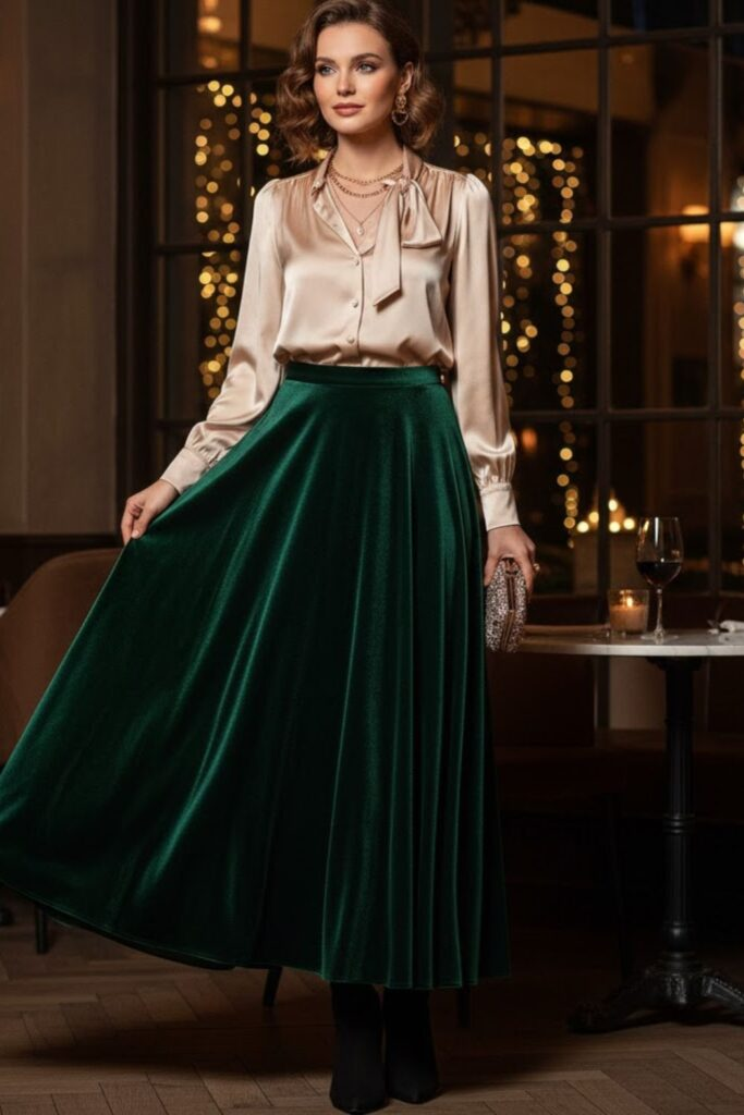 Luxurious velvet skirt in deep tones paired with a satin blouse for festive elegance. Heeled ankle boots and delicate jewelry complete the look.