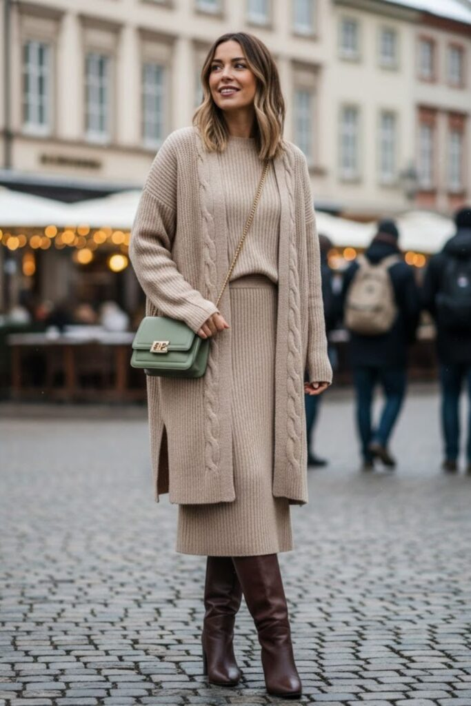 Coordinated knit skirt and cardigan in neutral winter hues, finished with tall boots and a crossbody bag for casual chic.