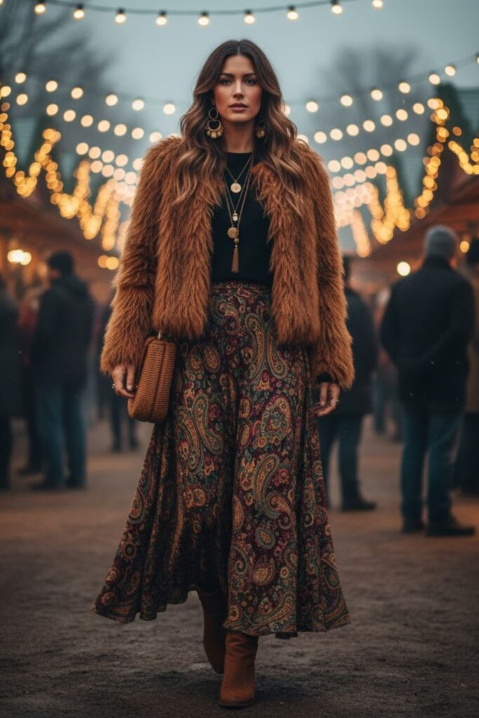 Bohemian textures with a flowy printed skirt and plush faux fur jacket. Earthy or jewel tones with ankle boots and statement earrings.