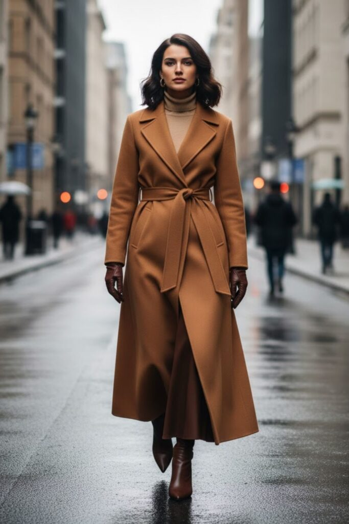 Streamlined elegance with a belted coat over a wool maxi skirt. Complementary tones, leather gloves, and heeled boots finish the look.