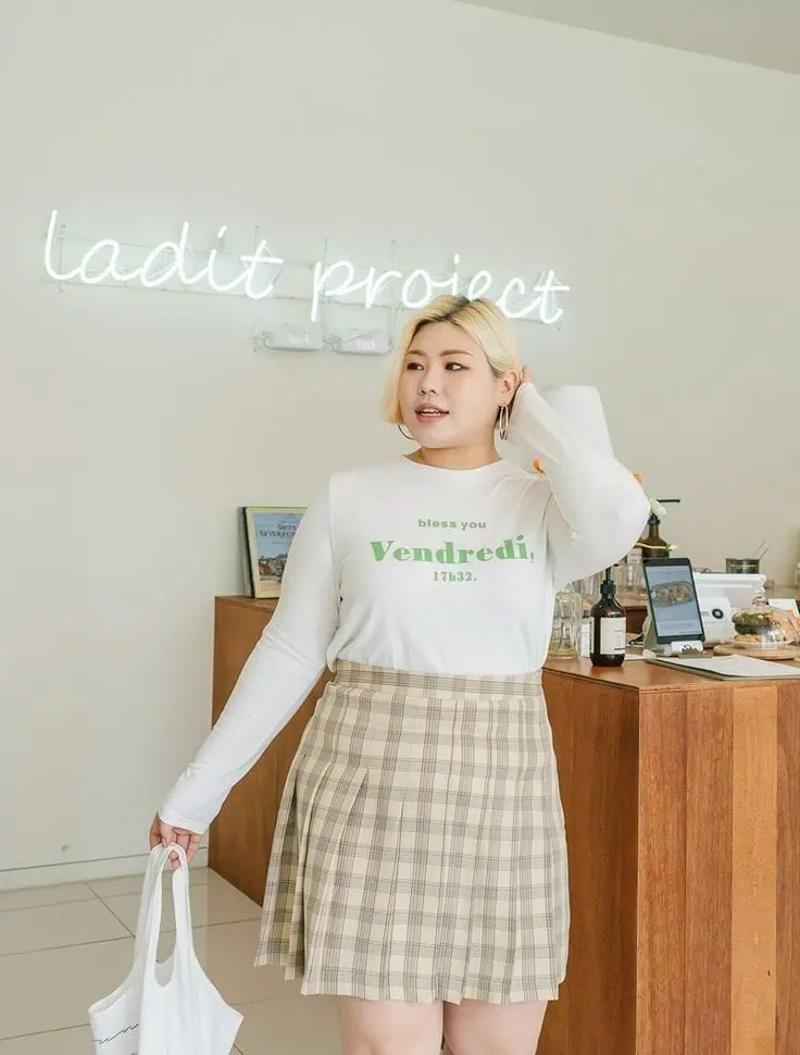 A long-sleeve graphic tee adds personality while keeping things cozy. Paired with a beige plaid pleated skirt, the look feels academic yet playful.