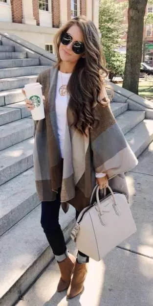 - Cozy Block Shawl Wrap and Skinny Jeans
