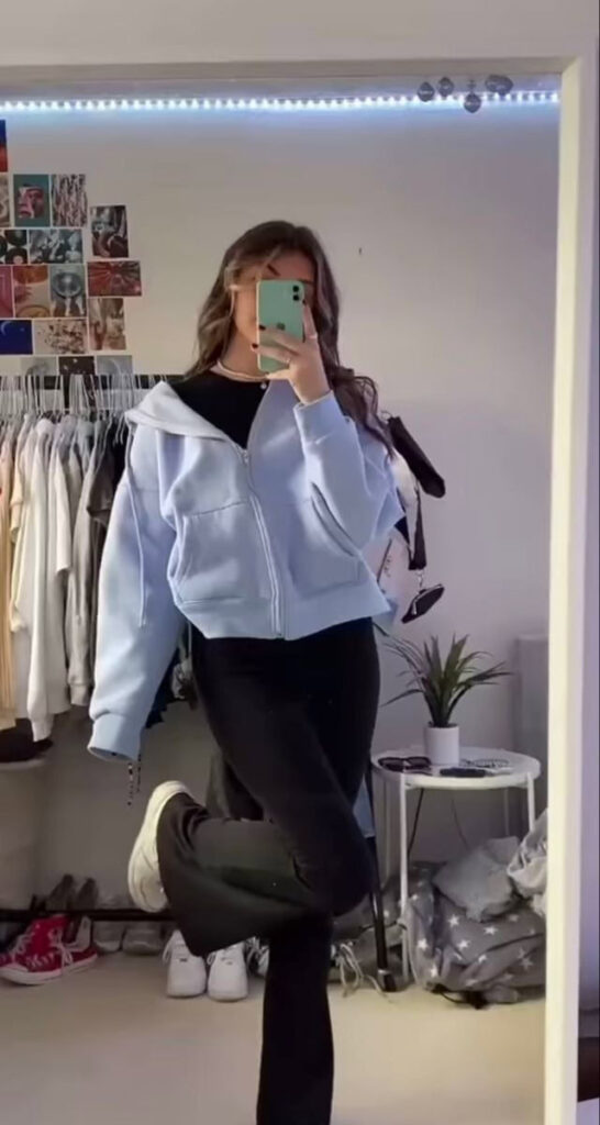 This charming look combines comfort with personality, featuring a soft blue sweatshirt adorned with an adorable teddy bear graphic. Paired with sleek black leggings and crisp white sneakers, this outfit strikes the perfect balance between cozy and put-together.