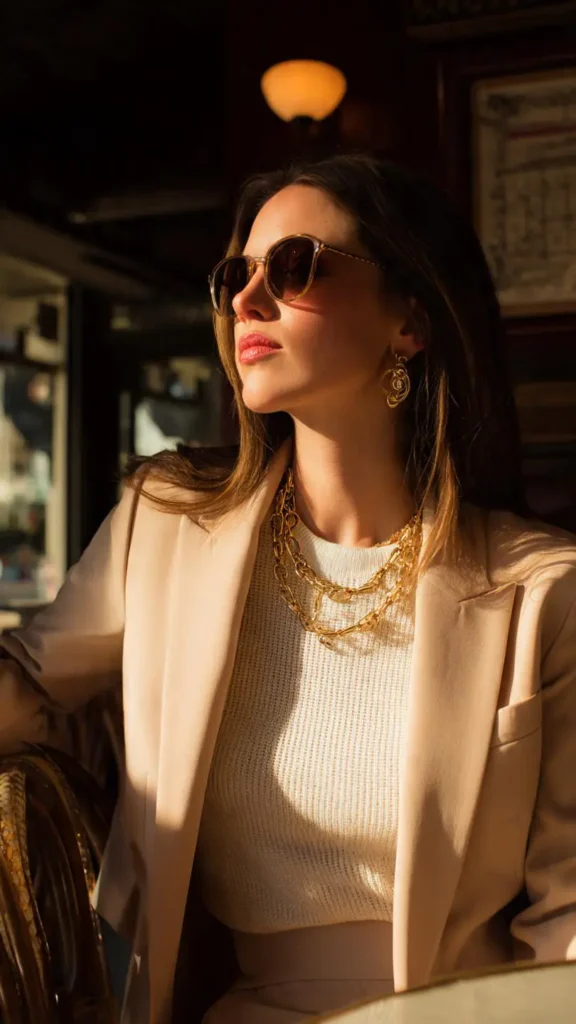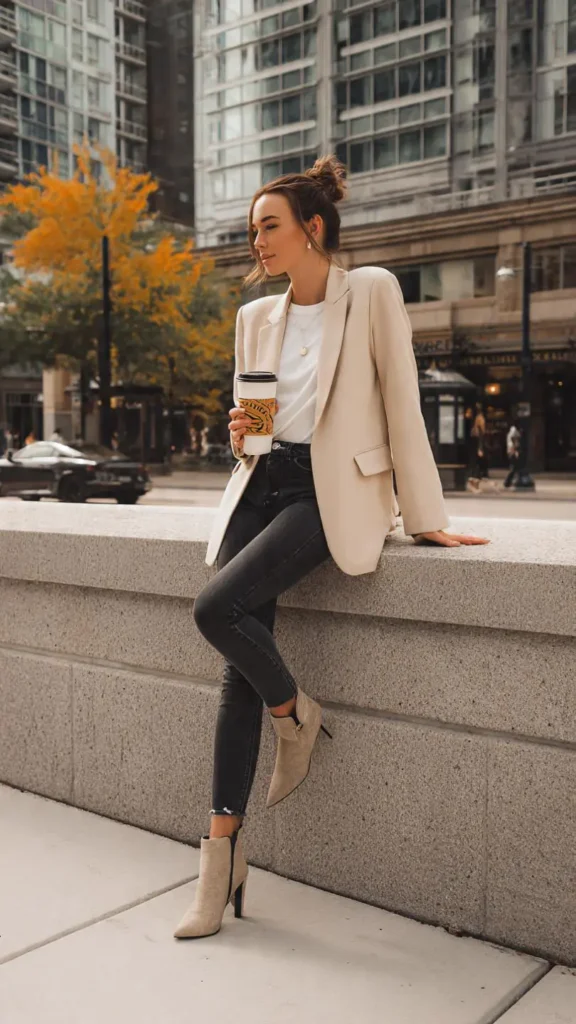 A neutral blazer over a simple knit creates a clean, minimalist Thanksgiving look. A few subtle accessories make the outfit feel complete.